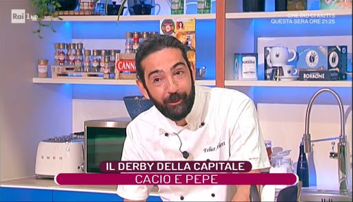 In gara contro il “Capitano” Paolo Presutti, romano verace, lo “chef cantastorie” canepinese si aggiudica quello che i conduttori Elisa Isoardi e Claudio Lippi chiamano “il derby della cacio e pepe”.